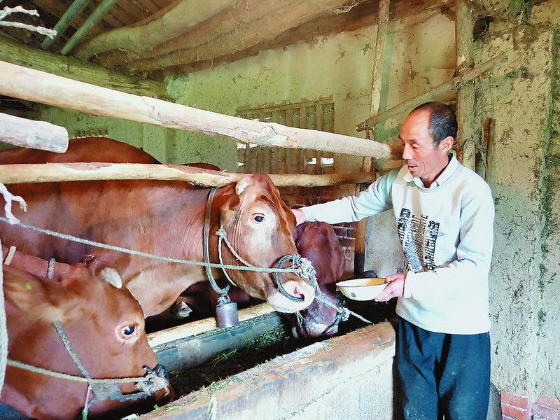 刘永林正在给牛喂草料。 本报记者 边浩 通讯员 杨雅芳 文/图
