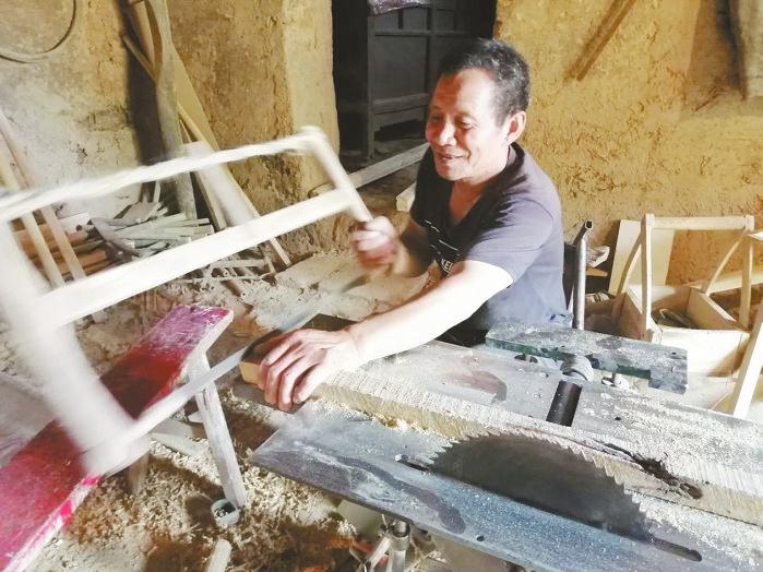 在洛南县委办驻村工作队的帮扶下,吴有民依靠兜底政策实现了脱贫。然而,不愿向命运低头的吴有民始终记着一句话:“国家政策再好,脱贫还要靠自己。”几年来,吴有民凭着过去当木匠的手艺,在一间破旧的柴房里“重操旧业”。他让家人把电锯、电钻、电刨子等放置好,工作台两边分别放一长条高凳和一靠背低凳。吴有民将收购的木料解板,加工木凳、车架子、案板等。