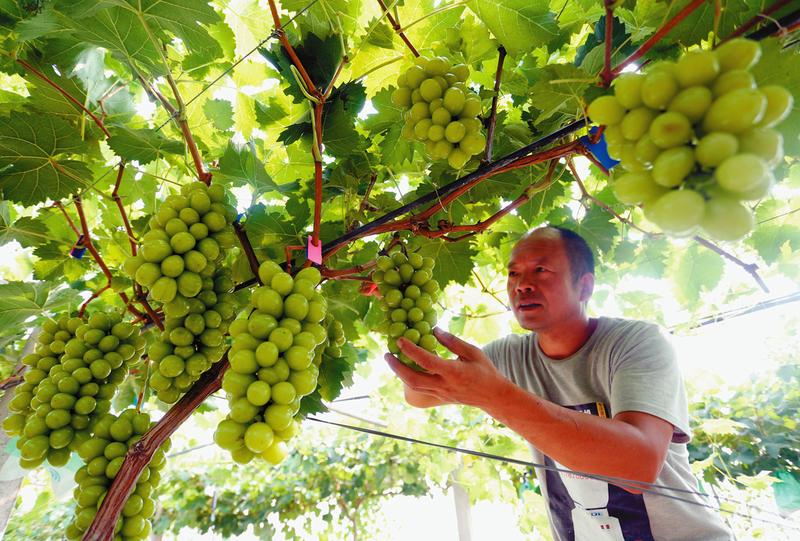 9月13日,渭南市临渭区崇宁镇线王村村民王伟正在采摘葡萄进行销售。