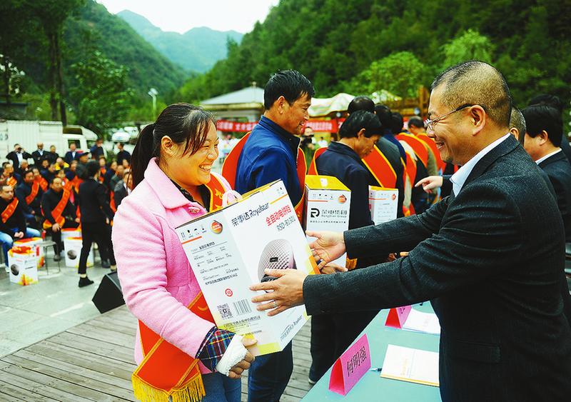 近日,宁强县太阳岭镇开展扶贫活动,表彰脱贫攻坚先进典型,同时为群众免费义诊,表演文艺节目等。图为该镇干部在为脱贫攻坚先进个人颁奖。