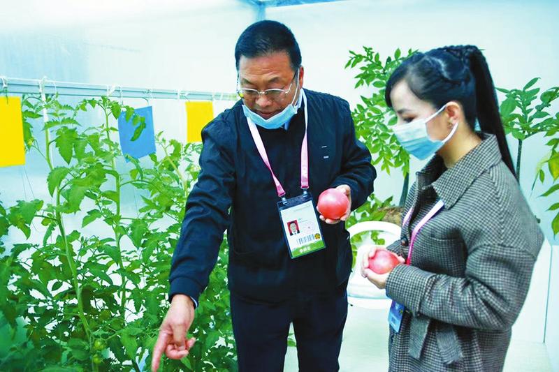 马新世(左)向王二妮介绍杨凌职业农民创业创新园培育的新品西红柿。