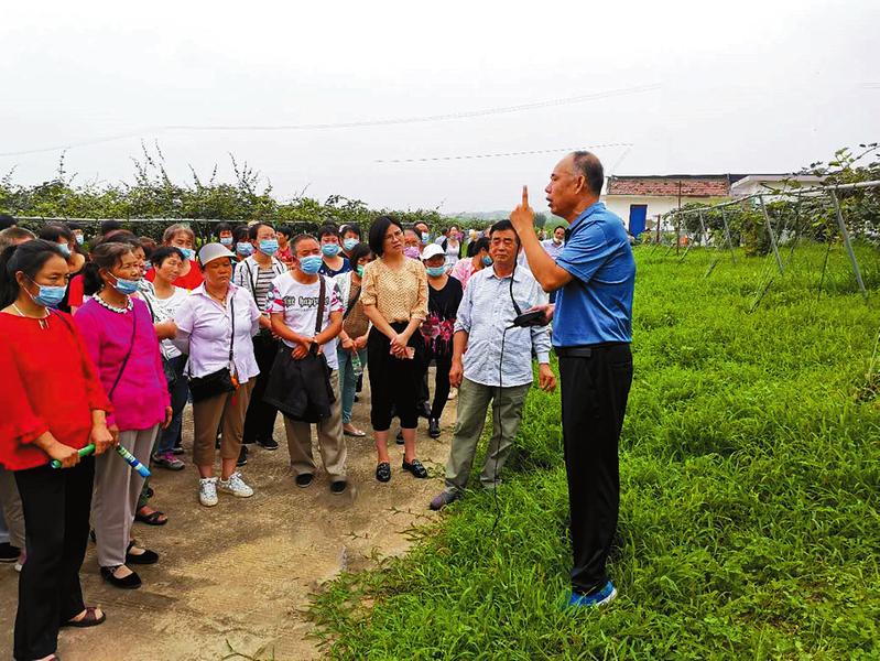 西北农林科技大学教授陈永安(右一)给村民讲解果树生产管理技术。(资料图片)