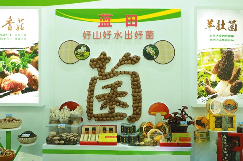 花菇木耳杏鲍菇,鸡枞灵芝孢子粉,左边一大篮子的香菇加上右边的羊肚菌,中间一个用“花菇”拼成的“菌”字。在蓝田展位上,巧思搭建的“菌”主题展位吸引了参展游客的驻足。