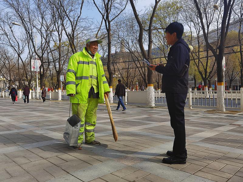 杨磊(右)采访环卫工人。