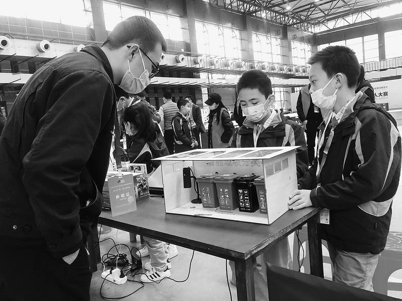 11月21日,在第三届中国(宝鸡)国际机器人暨智能制造展览会机器人大赛展区,宝鸡高新第三小学学生正在为嘉宾介绍团队研发的智能垃圾分类亭。