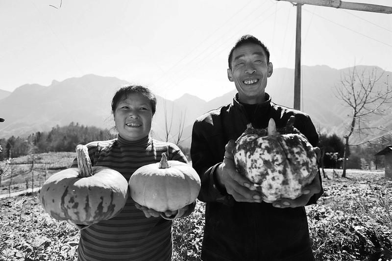 11月19日,镇坪县华坪镇团结村村民捧着丰收的魔芋与南瓜比个头。