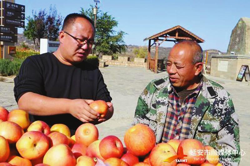 齐鹏(左)询问村民苹果销售情况。 本报记者 程立忠 通讯员 呼浩浩 文/图