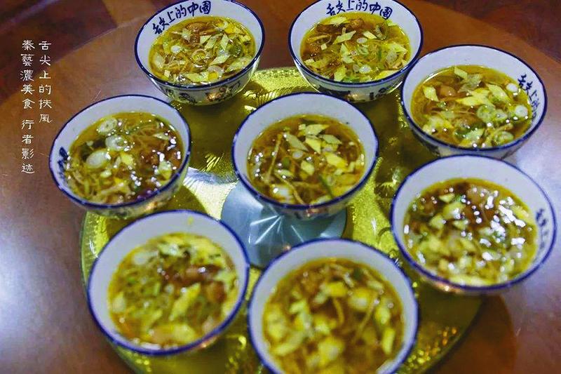 端一碗盛好的扶风臊子面,肉汤裹着绿、黄、黑、白的菜色,滚着油沫,飘着醋香,放双筷子,“狗娃子,快给你爷端去!”只见锅沿边一直等着的娃娃,端起碗就赶紧出灶房。汉子们一顿吃十碗八碗是没问题的,姑娘们也得三五碗。别惊叹这饭量大,这臊子面盛得少,汤浇得多,所以吃起来意犹未尽。
