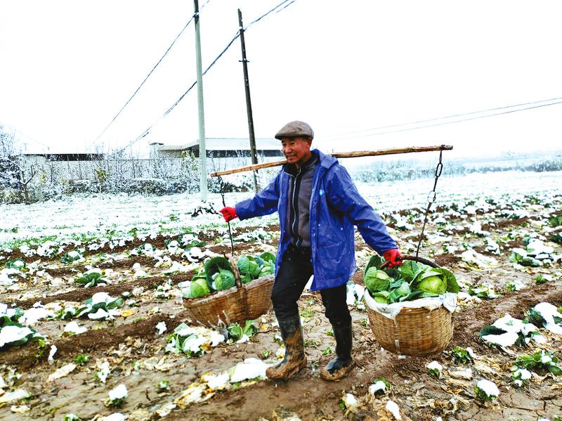 11月23日,雪花纷飞,为了保障露地菜菜品质量和供应,泾阳县口镇的菜农纷纷赶在上冻前收装甘蓝入库。图为菜农潘北胜忙着收装甘蓝。