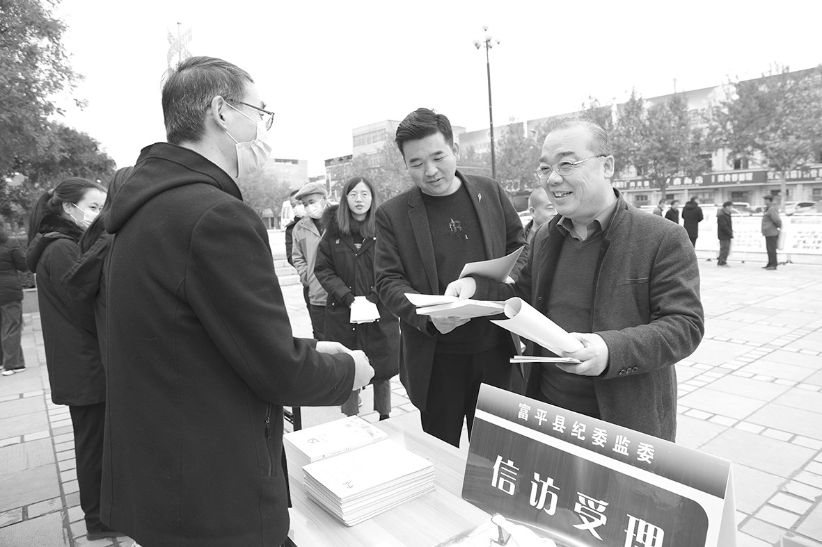 12月4日,富平县纪委监委结合国家宪法日,通过发放口袋书、读宪法、宪法宣誓、设置展板等形式,向群众宣传《宪法》《监察法》等党纪法规,营造学法、用法、守法氛围。