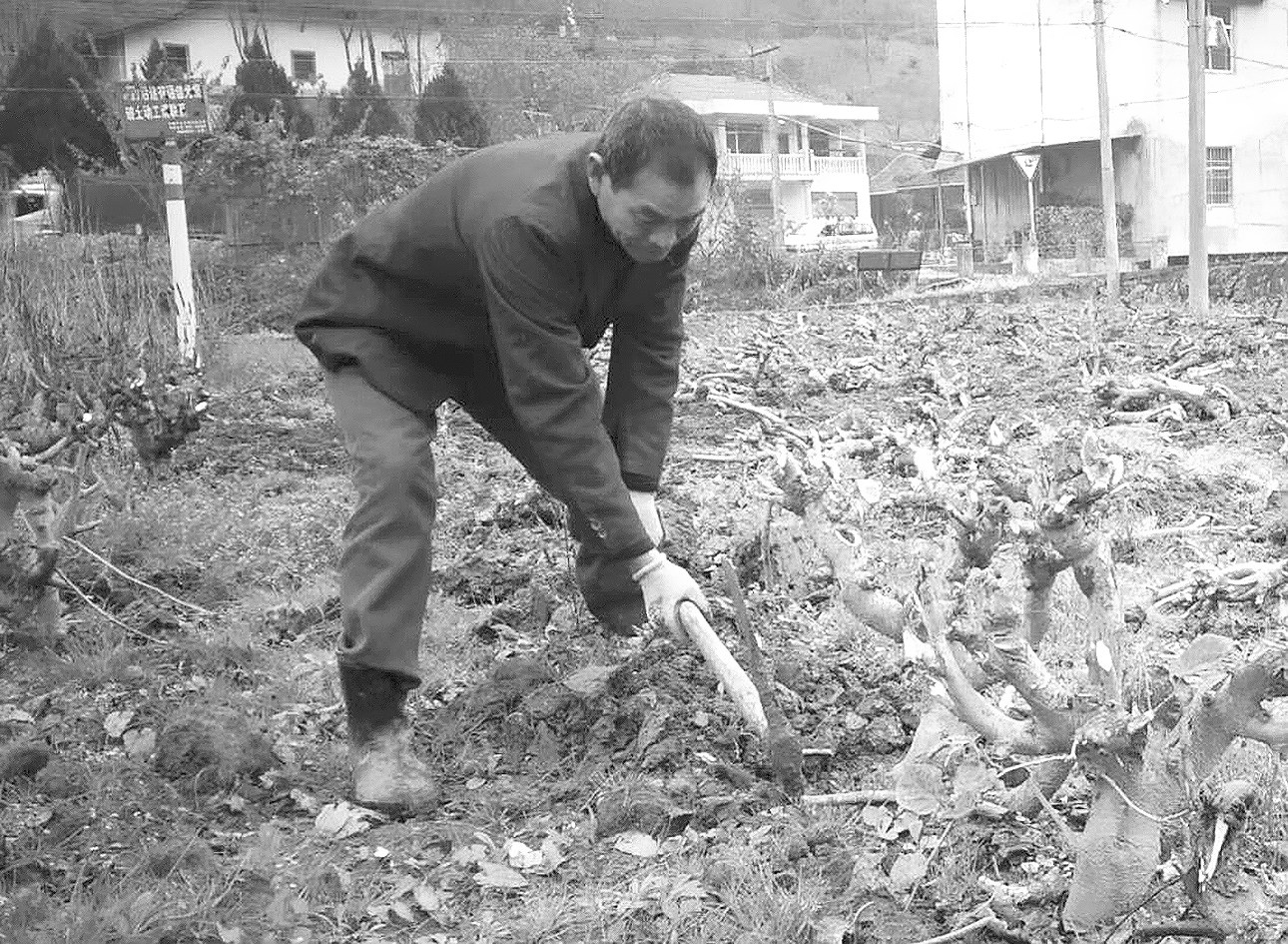 12月3日,石泉县饶峰镇新华村村民黄朝富在门口的蚕桑基地里,将已有15年树龄的老桑树挖掉。他打算开春后栽些桑树幼苗,为来年的桑蚕养殖打下良好基础。