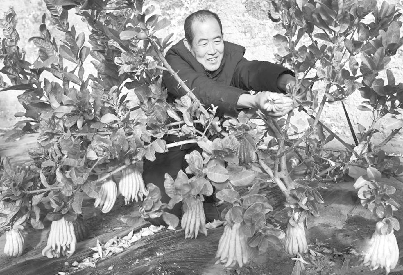 12月4日,榆林市榆阳区鱼河镇郑家沟村的王卫国在采摘温室大棚里的佛手。