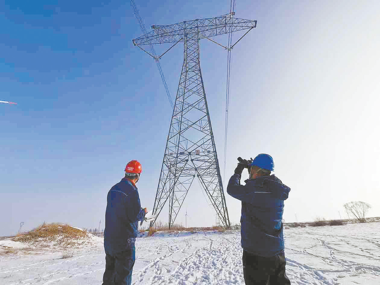 ④陕西送变电工程有限公司员工进行线路巡视,确保线路设备不受雪障覆冰影响。 许庚 摄