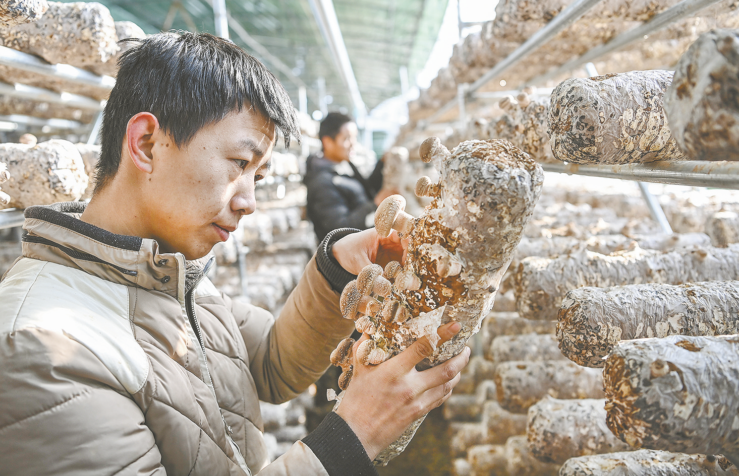 2020年12月30日,洛南岭南生物科技扶贫开发有限公司技术员王磊在香菇大棚里为菌棒疏蕾。