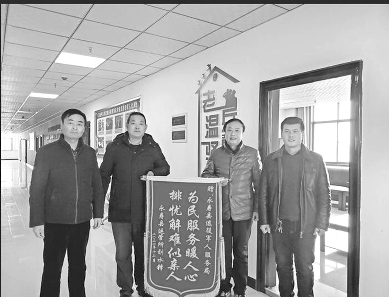 截至目前,永寿县退役军人事务局为退役军人申请发放省市县关爱基金21.3万元,协调相关部门为困难退役军人申请危房改造项目补助资金2.64万元。图为刘水锋(左二)将锦旗送到永寿县退役军人事务局。 记者 仵永杰 通讯员 白沛瑶