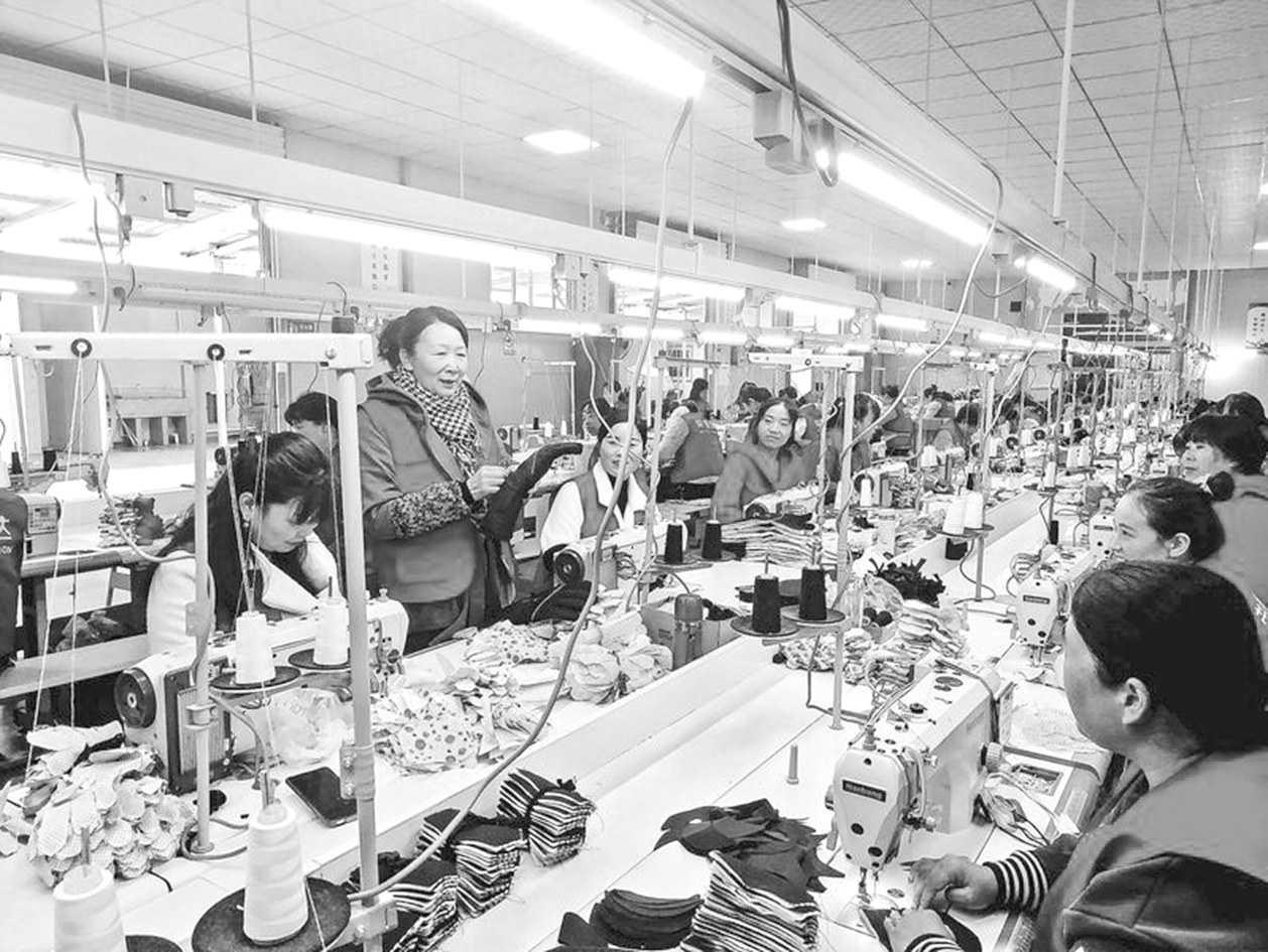 1月3日,洛南县三要镇三要街移民搬迁安置点商洛荣要达服饰有限公司厂房里,社区居民正在加工服饰。