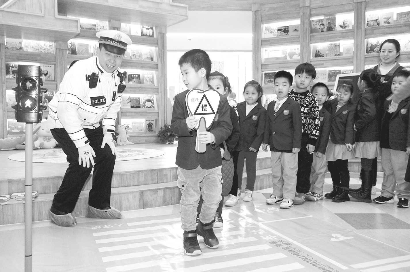 民警带着孩子们演示安全通过斑马线,让孩子们在寓教于乐中学到交通安全知识,从小培养他们养成自觉遵守交通规则的好习惯。