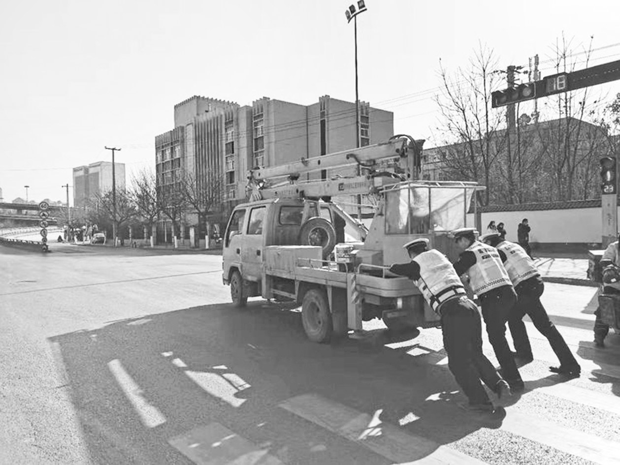 本报讯(记者 孙金龙 通讯员 潘晓梅 文/图)1月11日中午,西咸新区公安局沣东新城分局沣泾大道派出所交巡警中队民警在三桥缉查布控时,发现一辆工程车因为出故障停在路中间。
