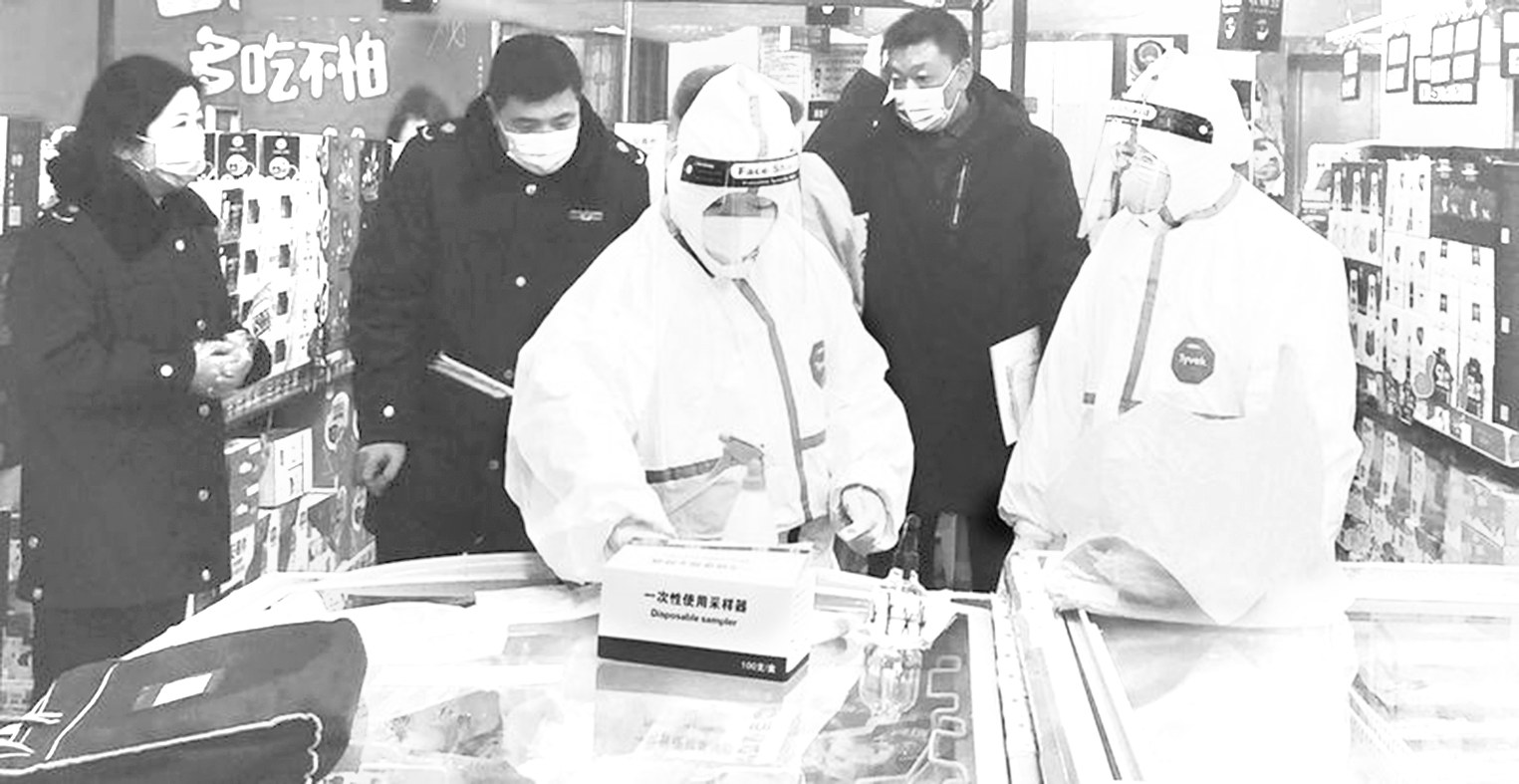 1月10日,佛坪县疾控中心对超市、农贸市场等冷链食品、肉制品、冷库及其从业人员,展开疫情防控监管和核酸检测抽样,坚决斩断病毒输入链条。图为工作人员正在对辖区一家超市冷链食品抽样检测。