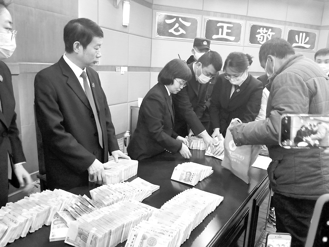 法官为农民工发放工资。 本报讯(记者 崔福红)1月15日,西安中院召开涉民生系列执行案件发放案款新闻发布会,通过转账与现金发放形式共发放案款8500余万元,涉及农民工5720人。