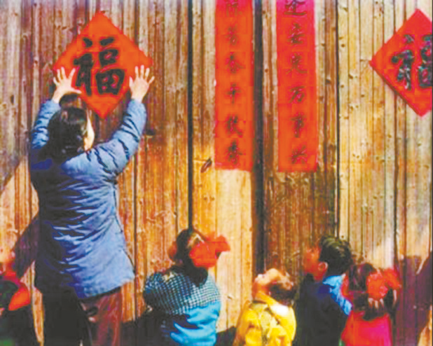 我事先按门的大小把红纸裁好,又裁上十几张巴掌大的正方形红纸写“福”字。表叔写字时,我站在旁边拉纸。每写三个字,表叔说声“拉”,我就把纸往前拉一点。表叔提笔蘸墨,嘴里轻声叨念着,手中的笔游走着。每写好一副对联,我就用手托着放在地上,用碎砖块压好四角,还要细心看着,防止不懂事的小孩或鸡狗猫走上来。对联在院子里晾着,红彤彤的一片又一片,特别显眼好看。等到对联上的墨迹干透了,我再小心地卷好拿回家。