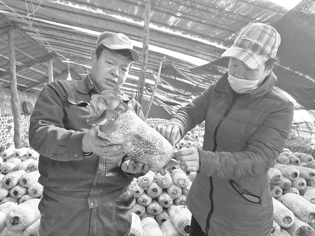 王建坤(左)、牛小娟夫妇展示自家种的蘑菇。