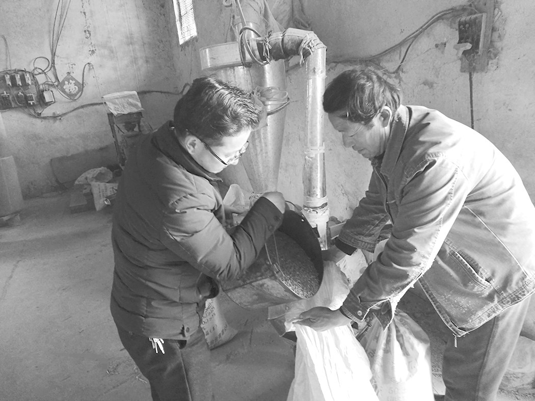 马高飞(左)帮村民装玉米。 本报记者 韩小珍 通讯员 杨雅芳 文/图
