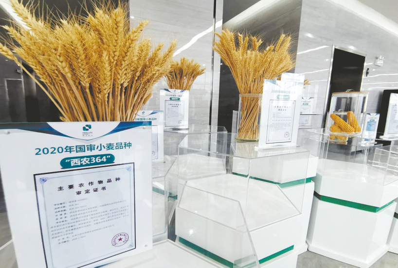 杨凌种业创新中心展示的部分国审小麦新品种。 本报讯(记者 杨杰 文/图)一粒种子,可以改变一个世界。今年省两会提出将实施种业创新工程,支持杨凌打造旱区“种业硅谷”,并列入我省2021年重点工作之中。
