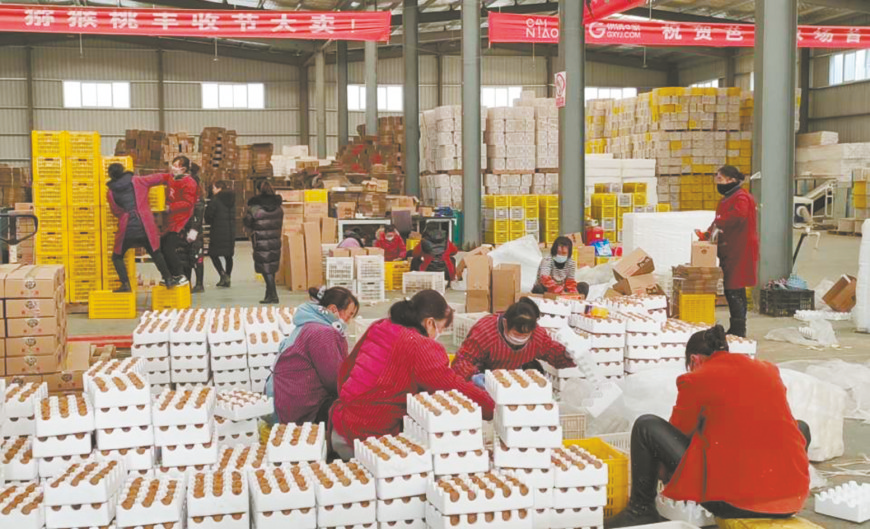 武功县陕西美农网络科技有限公司分拣中心的工作人员在分拣水果。 本报讯(记者 王琦 文/图)2月1日,武功县电商服务中心组织人员深入学习贯彻省两会精神,高点定位、精准发力,以新发展理念引领经济转型升级,把发展壮大电子商务作为主抓手,为经济发展注入新动力。