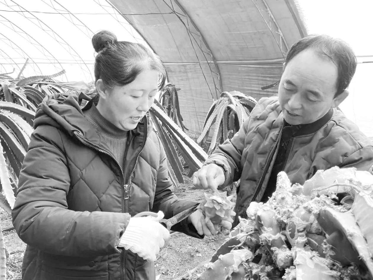 2月1日,在榆林市榆阳区鱼河镇郑家沟村沙地火龙果种植基地,种植户王二财和妻子正忙着查看果实的生长情况,为春节上市做准备。