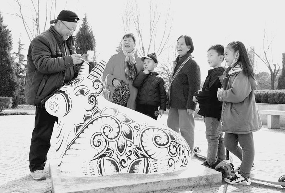 2月2日,宝鸡市金台区蟠龙镇民间画师米天意(左一)在宝鸡市渭河生态公园十二生肖雕塑广场上,精心给牛、狗、龙等雕塑描画纹饰。 卢志平 摄
