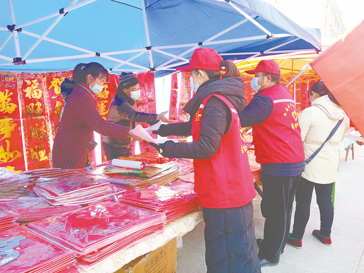 志愿者在宣传疫情防护知识。 本报讯(记者 靳天龙 文/图)“您好!我们是疫情防控工作人员,请您配合测量体温,佩戴口罩。”2月5日,在商洛市五洲生活超市门口疫情防控检测点,工作人员对进入超市的人员逐一登记、测量体温。在当前疫情防控工作中,商洛市动员各方力量,群防群控,确保百姓过一个快乐、平安年。