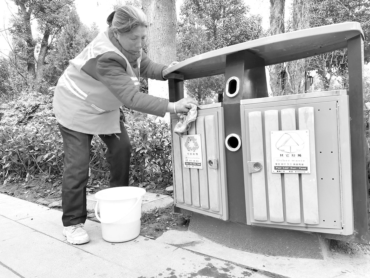 春节期间,城固县广大环卫工人坚守工作岗位,全力保障节日期间城市环境卫生整洁干净。图为2月14日,城固县乐城公园环卫工人胡燕燕正在擦洗垃圾桶。