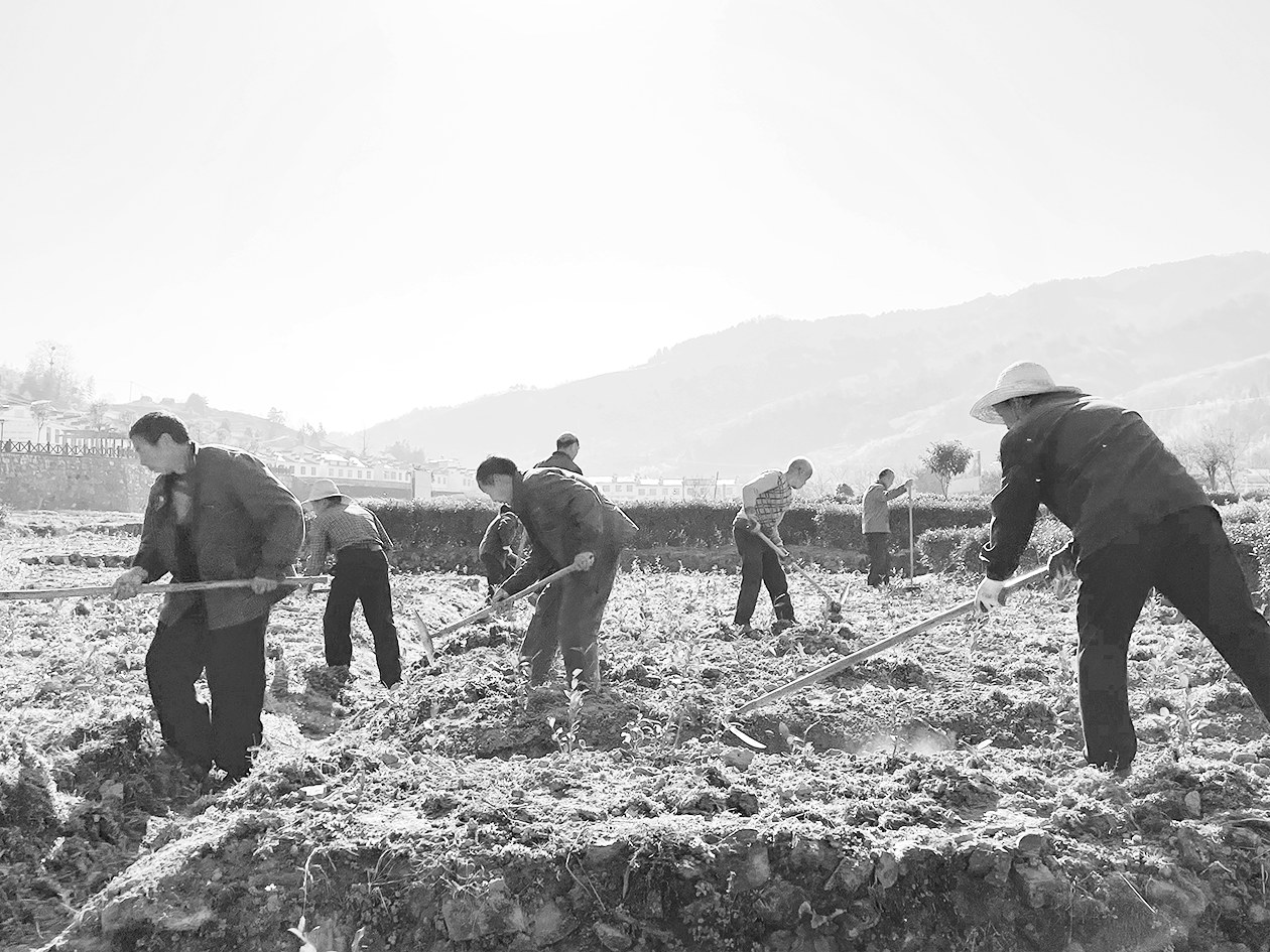 2月20日,在平利县长安镇中原村新建茶园内,茶农们抢抓农时为茶苗除草追肥。