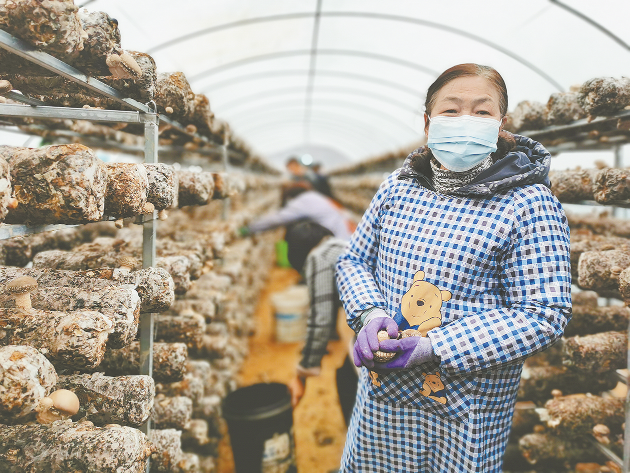 刘国芹正在采摘香菇。 本报记者 姚远 文/图
