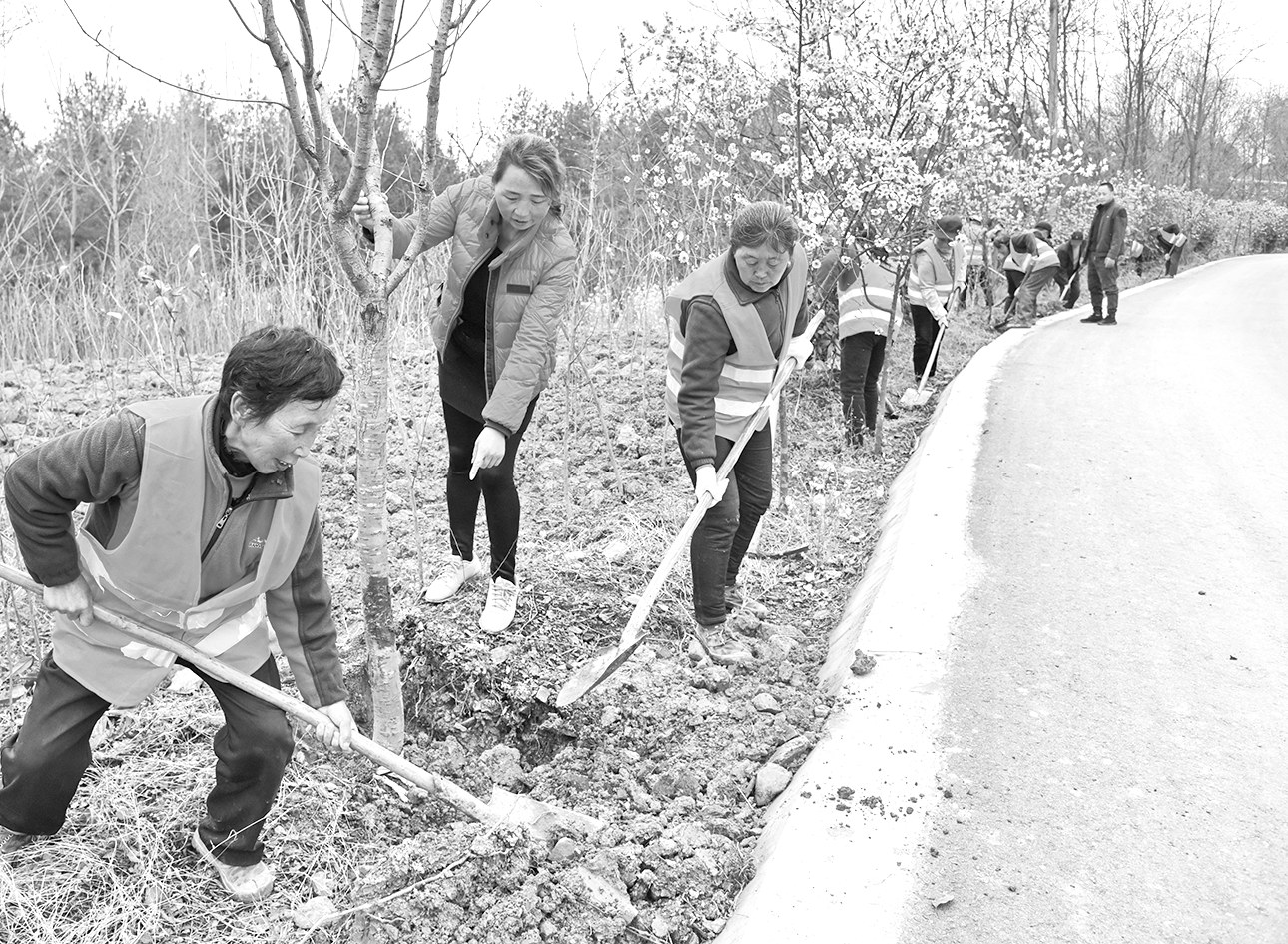 3月9日,宁强县高寨子街道肖家坝村村民正在山路旁栽植红叶石楠。