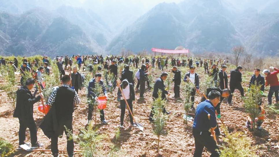 ◀干部职工在西安市鄠邑区涝峪镇八里坪村营盘沟口植树。