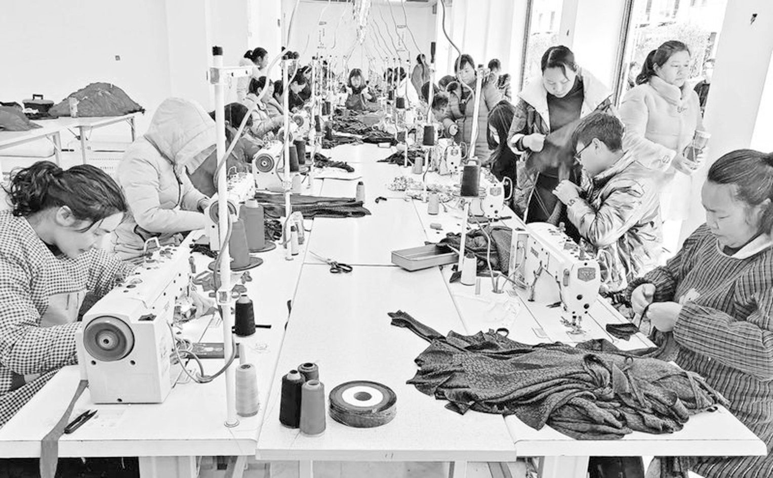 3月23日,山阳县西照川仁和绿园搬迁安置小区程晨服饰加工厂里,工人们正在加紧赶制工服。