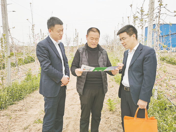 在咸阳绿港种植专业合作社的苗木基地,乾县中银富登村镇银行工作人员为刘建成(中)讲解金融知识。