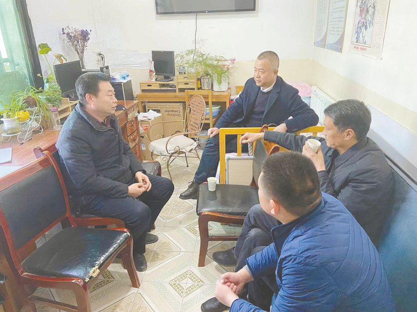 周至农科村镇银行董事长赵社孝(左二)在四屯镇了解该镇农村产业发展情况。