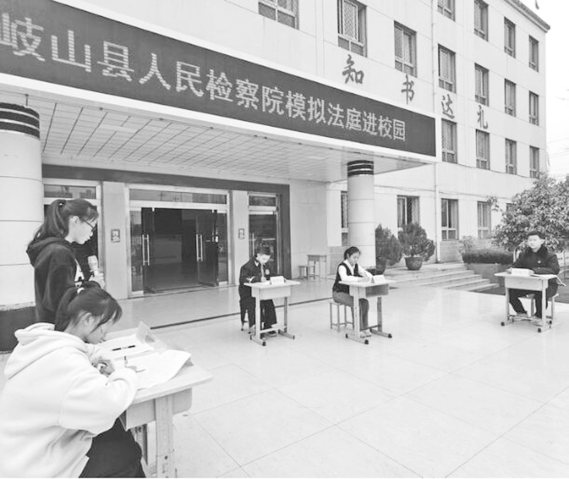 本报讯 (罗琴 员婉莹 文/图)“现在宣布开庭!”随着一声法槌声响起,一场“别开生面”的模拟法庭开始了……近日,岐山县蔡家坡镇陕九学校1200余名师生与岐山县人民检察院的检察官共同观摩了一场模拟庭审,以此对师生进行法治教育。