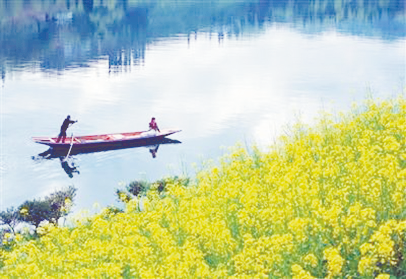 春雨的滋润,春风的爱抚,使油菜像疯了一样,拼命向上长。汉江边的地块,海拔低,水分足,土壤肥,菜薹粗壮高挺,菜叶肥厚宽大,青中透绿,生机勃发。春阳沐浴着它,温暖着它,油菜终于按捺不住绽放的激情,一个个细小的花蕾徐徐张开,笑迎着明媚的春光。花儿们像在参加一场重大的赛事活动,你追我赶,竞相开放,汉江两岸仿佛飘着金色的飘带。岸边是金色的世界,那是金黄的油菜花;水里是金色的幻境,那是风姿绰约的花影。有了油菜花的渲染,汉江便有了春天的色彩,有了春天的气象。