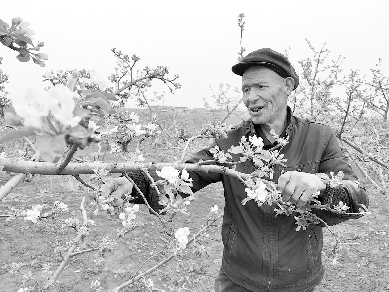 4月7日,永寿县监军街道永安村六组果农安忠林正在给苹果树疏花。