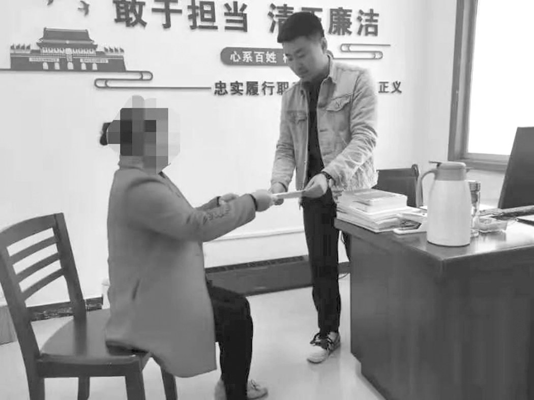 刘某从司法所工作人员手中接过存款。 本报讯(记者 黄敏)“真是太感谢你们了,解决了我的大难题,让我少跑了很多路。”4月13日,石泉县迎丰镇村民刘某顺利领取了已故丈夫的存款。