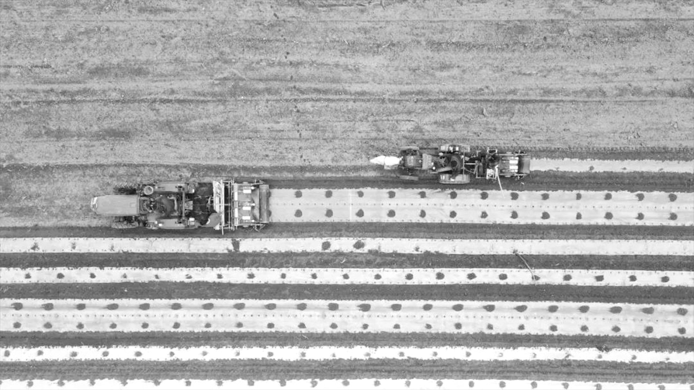 4月16日,在旬邑县湫坡头镇太堡村旬邑建农家庭农场有限公司的农田里,工作人员正在使用拖拉机和播种机种植玉米。