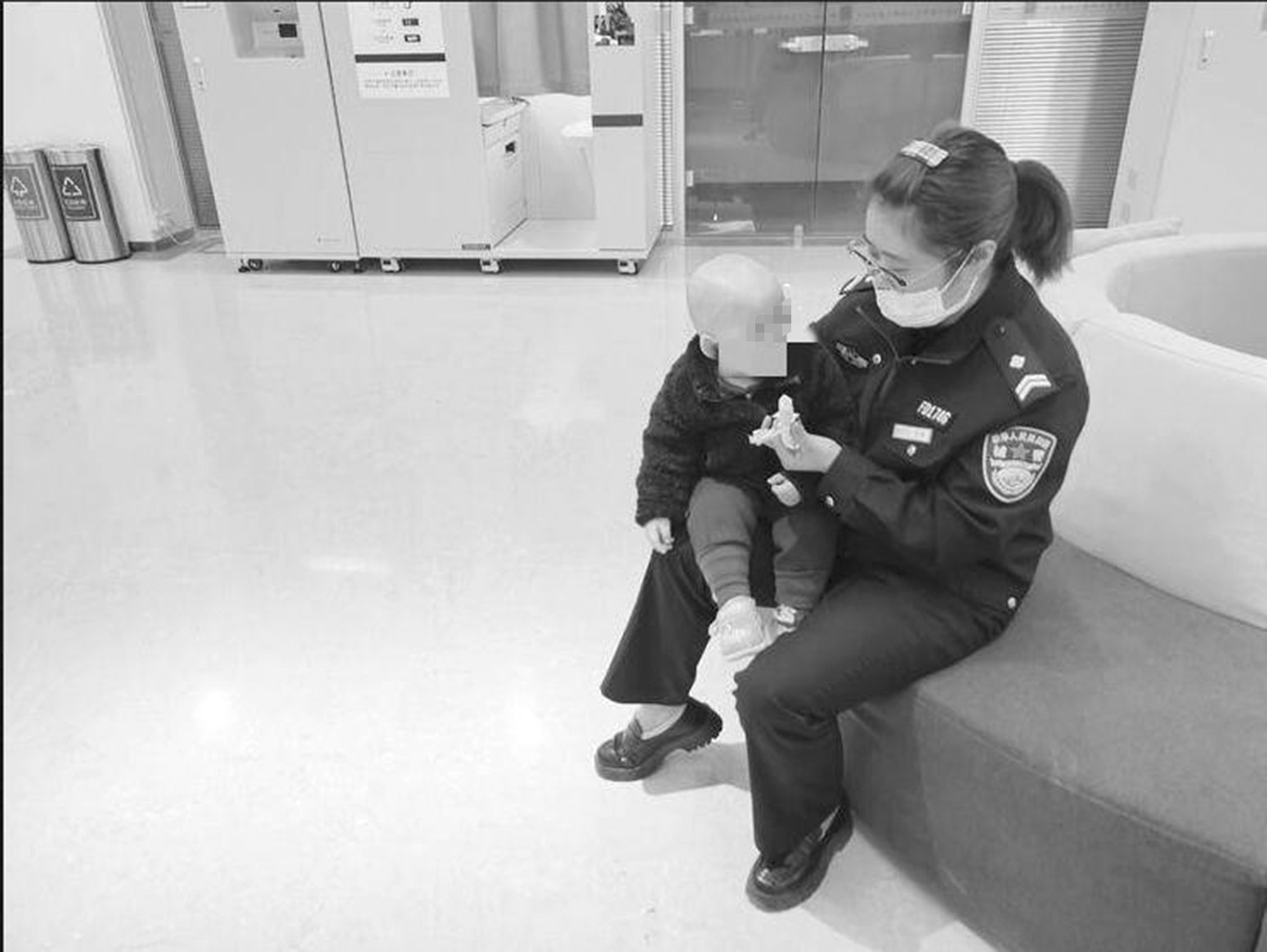 派出所民警岳倩发现后,立刻伸出了援手,一边将小孩子抱到自己怀中,一边拿出给自家孩子新买的零食,轻声地抚拍起来,孩子渐渐止住了哭声,虎头虎脑的样子引得大家纷纷过来逗他玩。另一名工作人员也帮忙抓紧时间填表,张女士顺利地办完了业务。