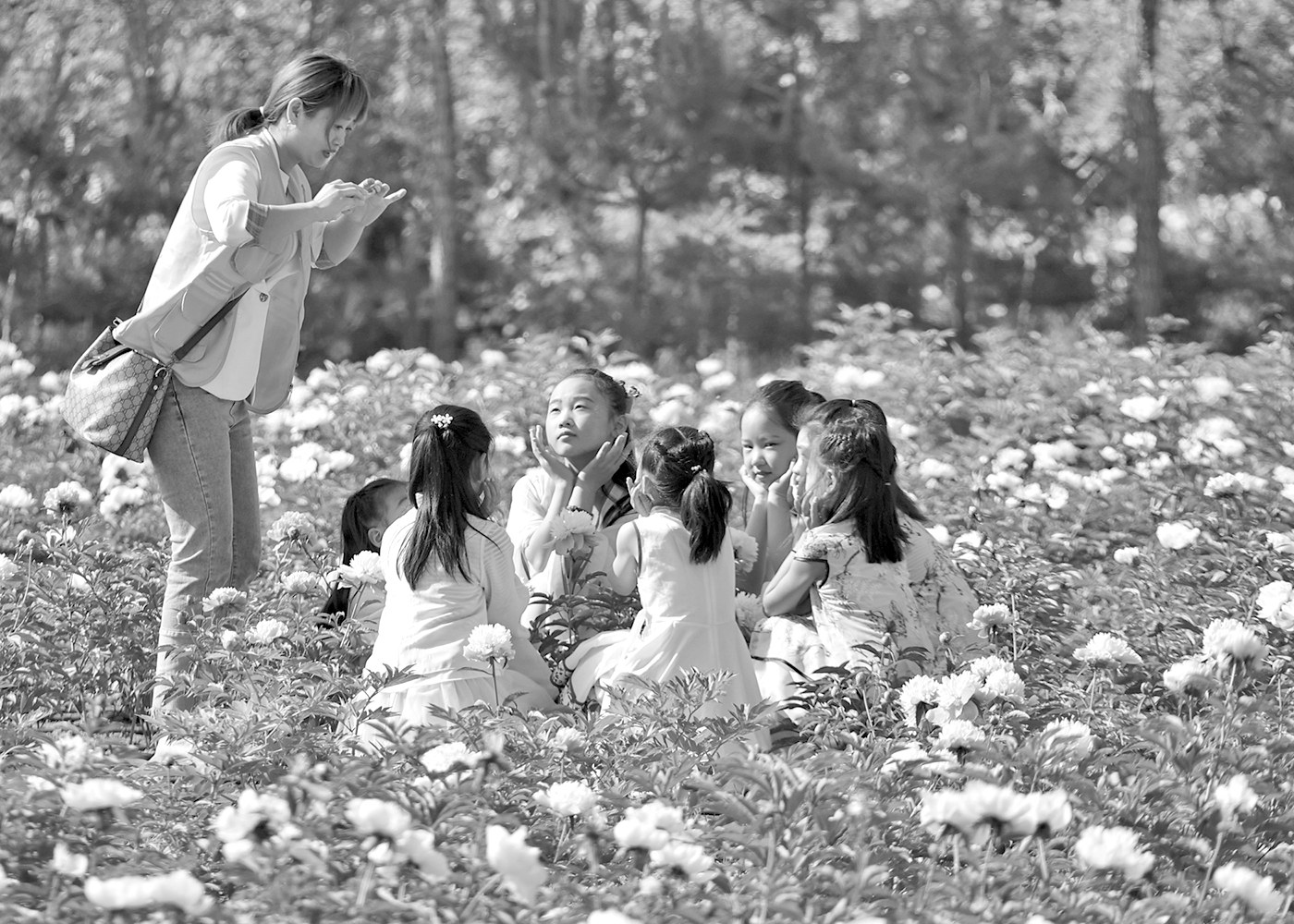 5月5日,在大荔县沙苑牡丹园里,牡丹、芍药、蓝香芥姹紫嫣红,亮丽的风光让游客大饱眼福。