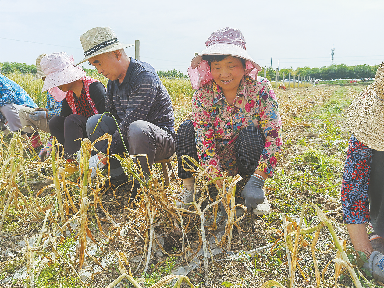 5月27日,在扶风县段家镇段家村邳州大蒜产业基地里,村民高巧莲(右一)和其他务工群众正在挖大蒜。
