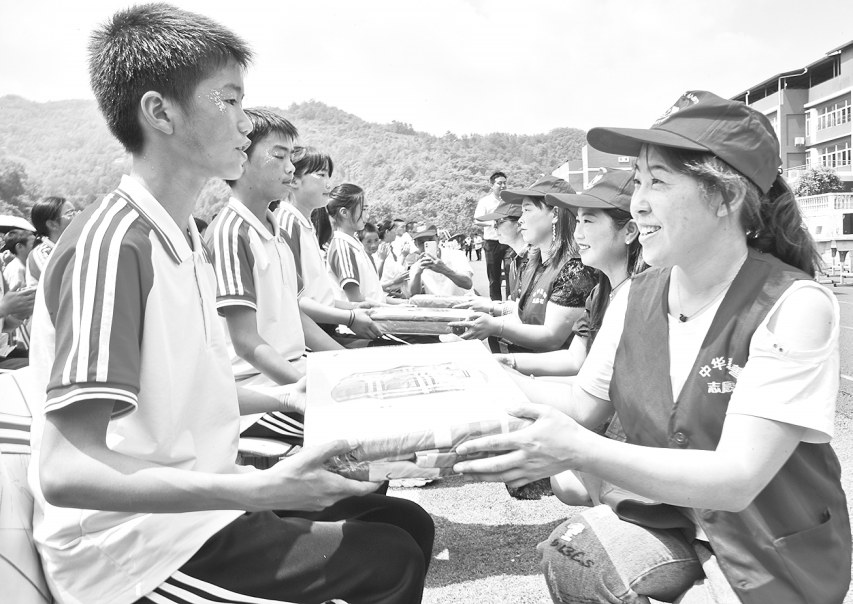 5月31日,宁强县慈善协会志愿者为毛坝河镇中心小学的学生发送慰问品。