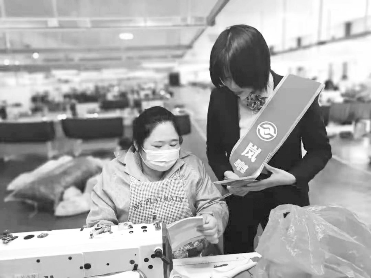 岚皋农商银行工作人员杨章乔(右)在岚皋富岚工艺有限责任公司为群众宣讲金融知识。 本报记者 赖雅芬 通讯员 王功安 文/图